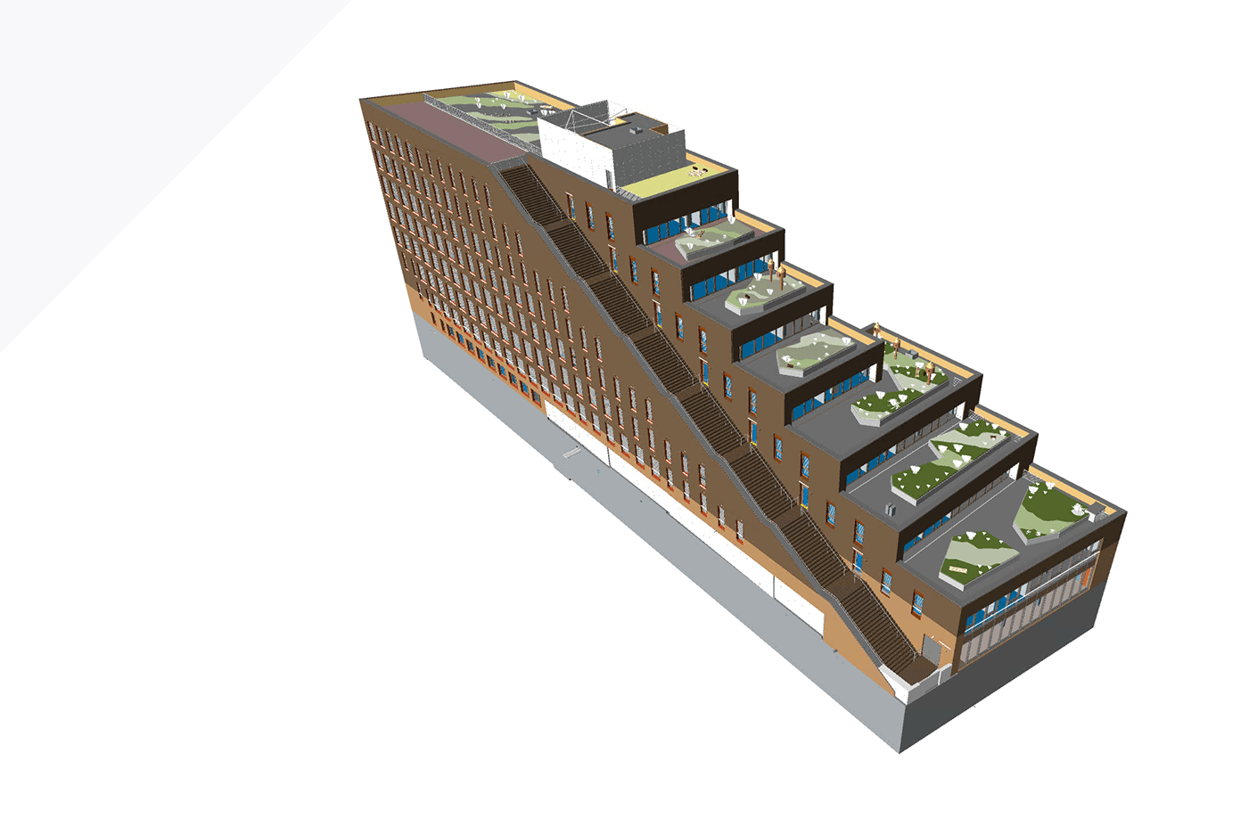 Marquant l’entrée du village des athlètes, le bâtiment « Les Gradins » hébergera à partir de juillet 2024 les meilleurs athlètes mondiaux, avant d'être transformé en immeuble de bureau dès l'automne.